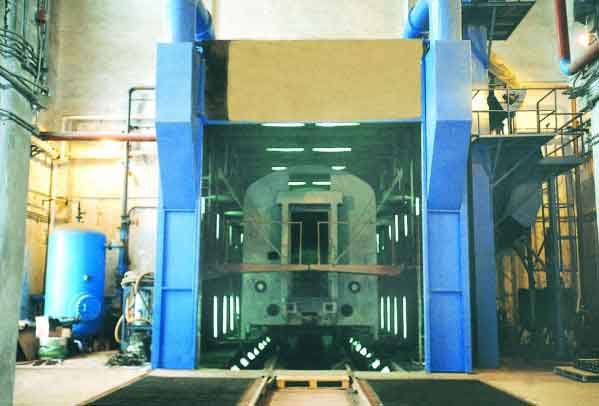 動車用拋(pāo)丸室設備主(zhǔ)要用於用戶新(xīn)造的碳鋼、鋁合金、不鏽鋼車內外表麵的噴丸處理。同時,該設(shè)備還應適用於(yú)碳鋼和不鏽鋼車身及零件(jiàn)的噴丸處理。設備應滿足噴丸工藝的以下基(jī)本要求(qiú):待清理的工件(車體)經表麵脫脂、幹燥後進入噴丸室;手動手(shǒu)持拋丸槍,在拋丸室內(nèi),借助坑和操作台,對車輛各部位表麵進行拋丸清理;大部分被噴灑的介質通(tōng)過地麵格柵進入地麵下的(de)縱向水平(píng)刮板輸送係統),該係統將介質輸送至(zhì)橫向螺(luó)旋(xuán)輸送機,並將顆粒通過鬥式提升機送至風選裝置,在風(fēng)選裝置中粗顆粒可與粉塵和好的介質顆(kē)粒分離;風選擇的聲音介質進入儲料鬥,自動落入氣壓輸送罐,介質連續(xù)噴出時氣壓罐自動補充;噴砂室內的灰塵通過設(shè)置在噴砂室側麵的吸塵口被吸入濾芯吸塵器;整車拋丸作業完成後,操作人員會將散落在車內的沙(shā)粒清理幹淨,落到地麵網格下,通過拋丸輸送係統自動送回儲(chǔ)料鬥。噴丸處理後,表麵具有一定的粗糙度(dù),提高了產品的耐腐蝕性和表麵(miàn)質量。