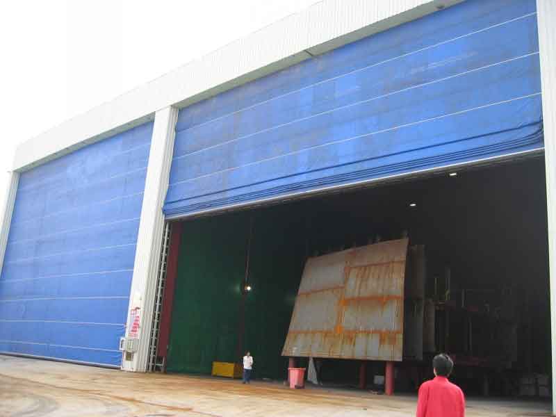 柔性升降大(dà)門安裝 柔性升降門主要用於造船業的塗裝車間和大跨度車間,替代(dài)重型鋼門。一套安全可(kě)靠的起升(shēng)機構用於閘門(mén)的折疊、提升和開啟,主要由起升機構、門體(含(hán)三防PVC布)、安全防墜製動裝(zhuāng)置、限位器、合金導軌、電氣控製係統等組成。它結構合理(lǐ),運行輕便穩(wěn)定,安全可靠。